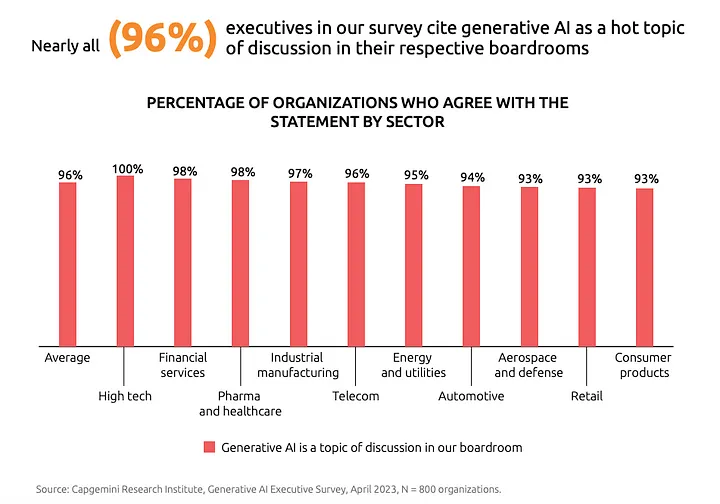 Capgemini reports 96 % of execs call generative AI a board-hot topic, yet only 10 % of the U.S. labour force actively tests ChatGPT-class tools.¹